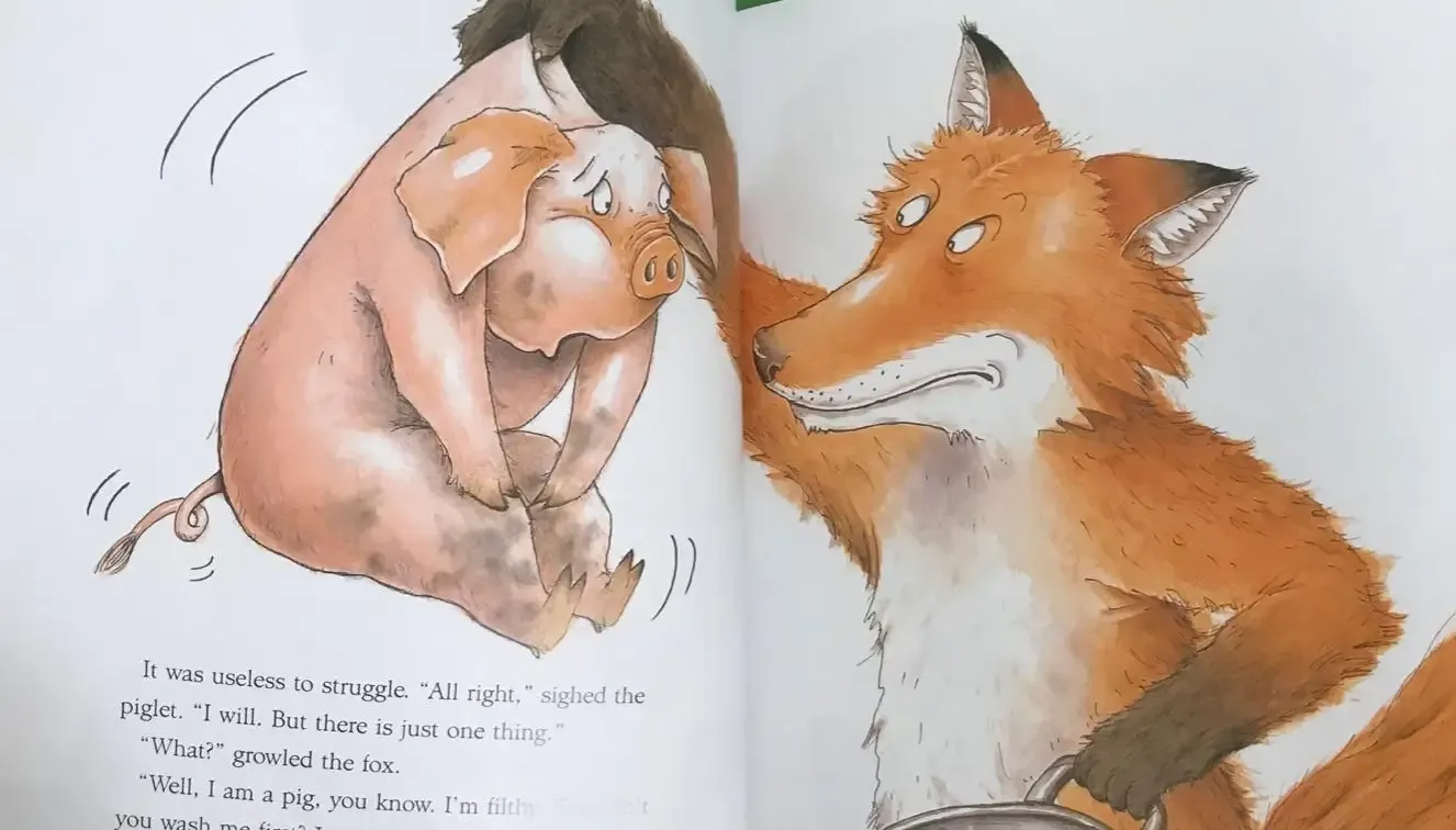 However, it quickly becomes apparent that the pig is not as helpless as he seems. With a series of clever tricks and flattering words, the pig convinces Mr. Fox to give him a bath, feed him a hearty meal, and even give him a relaxing massage, all under the guise of making him taste better when Mr. Fox finally eats him. As the story unfolds, it becomes clear that the pig is using his smarts to manipulate the situation, slowly tiring out the fox and buying himself time.